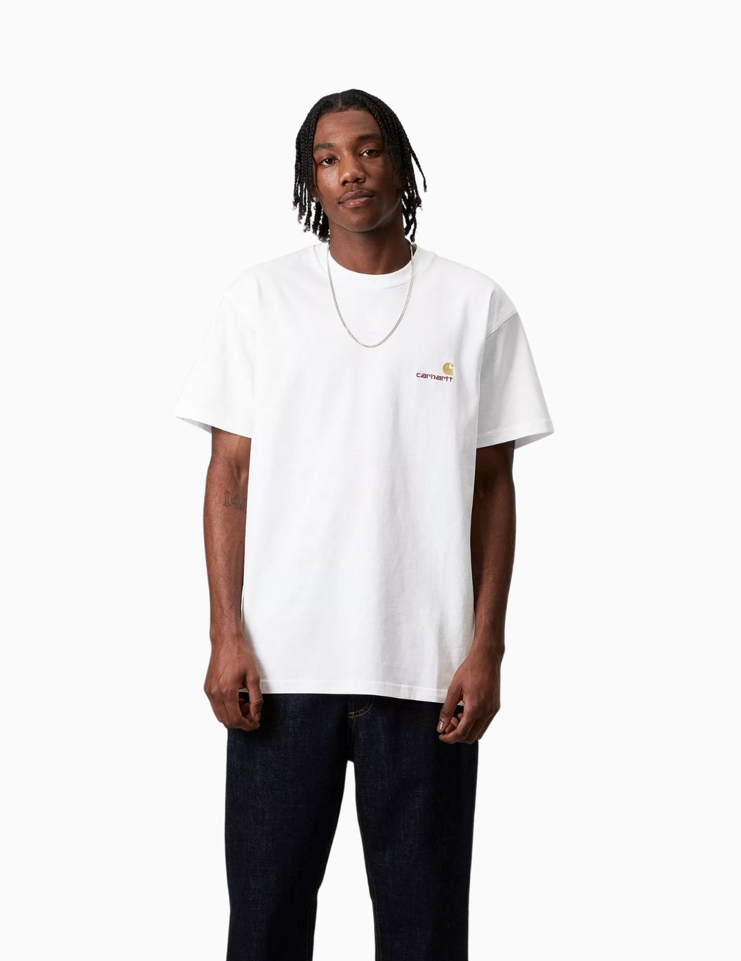 La S/S American Script T-Shirt está confeccionada en punto de algodón orgánico. Presenta nuestro logotipo con texto en dos tonos bordado en el pecho. Corte holgado.