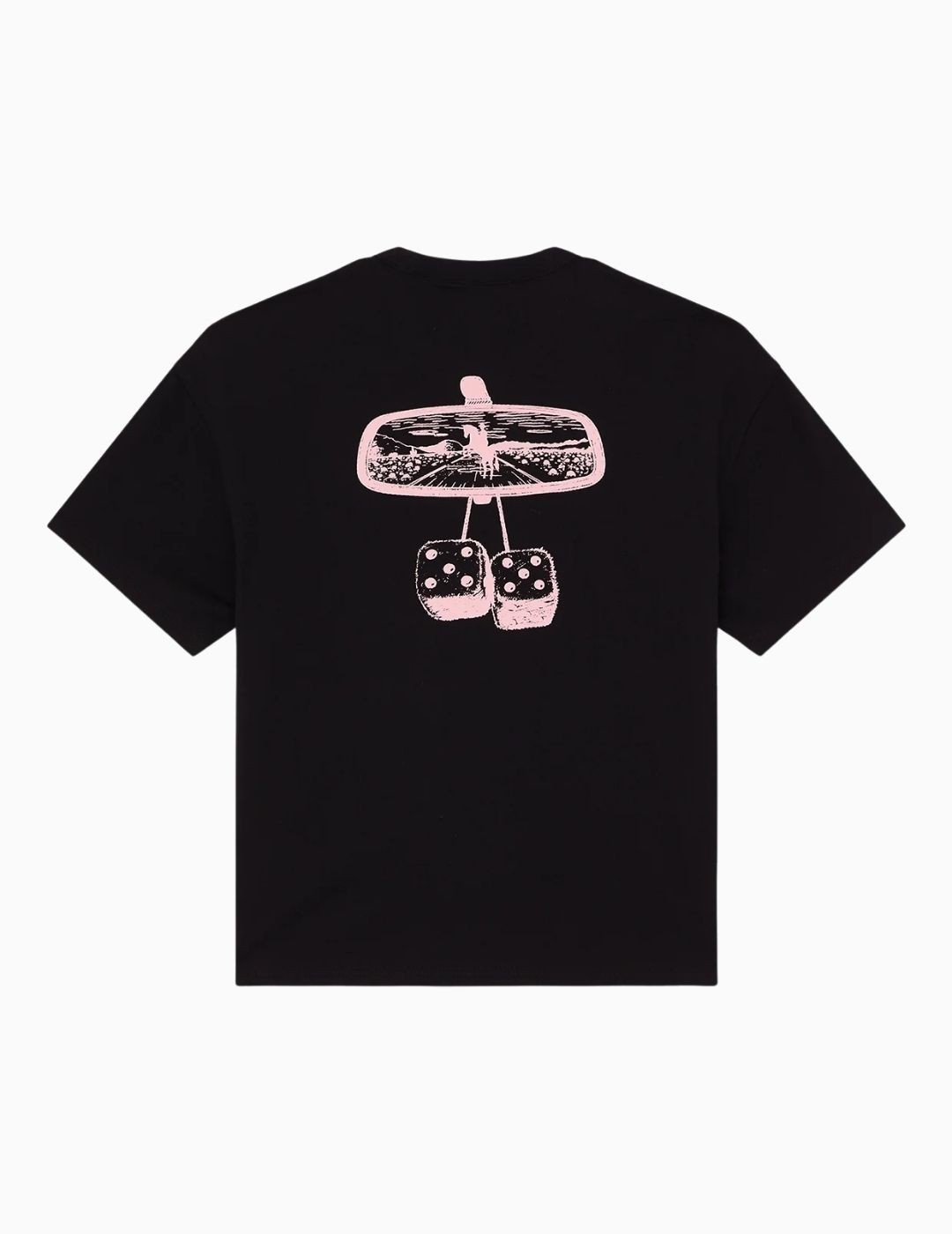 - Ilustración de retrovisor con vista trasera y dados en la parte delantera