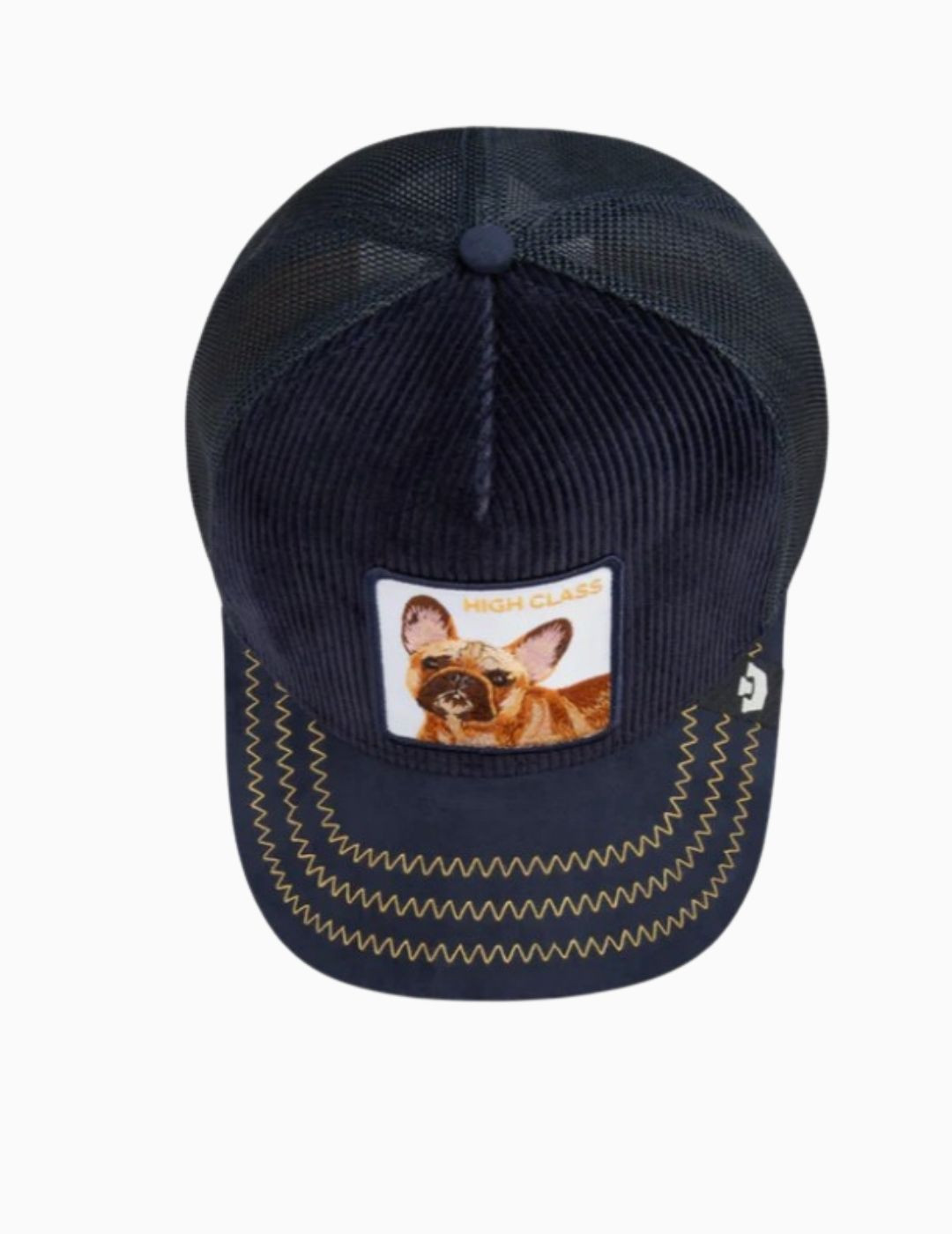 Gorra trucker Goorin Bros Courtside Empire OG se despliega en texturas azul marino sobre azul marino con costuras doradas tan suntuosas que deberían incluir una categoría impositiva. El parche Frenchie aporta la dosis justa de energía de "no puedes sentarte con nosotros": a partes iguales de descaro, estatus y un toque sutil.