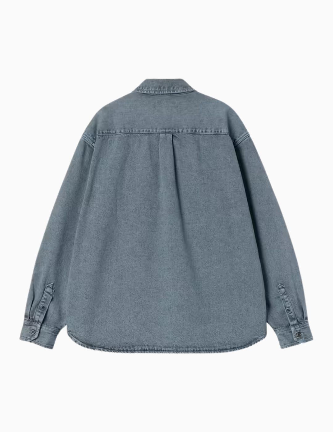 La Tigan Shirt Jacket se ha confeccionado en denim de algodón pesado y no tiene forro. La prenda está disponible en una versión lavada con efecto usado que ofrece un acabado desgastado y saturado, y en otra versión blanqueada a la piedra que le otorga un aspecto más claro. En la parte delantera aparecen dos bolsillos con solapa. Una etiqueta cuadrada tejida completa el diseño.